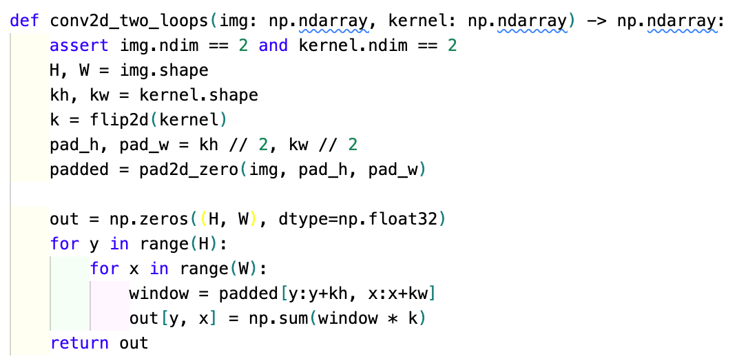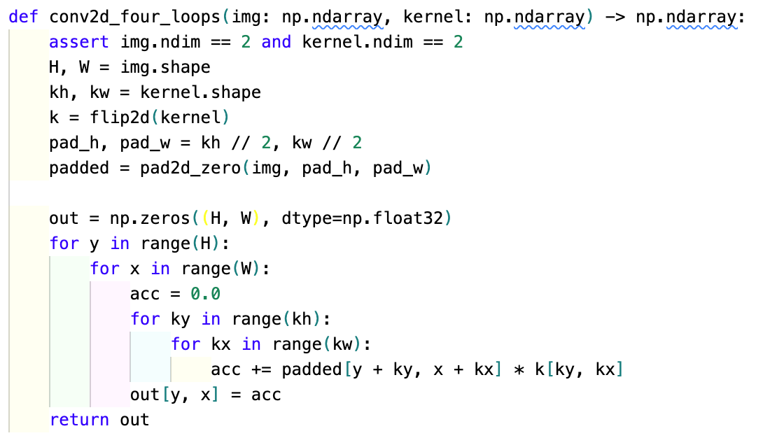), I iterate over every output location and, for each, run two inner loops over the kernel indices , explicitly accumulating padded[y+ky, x+kx] * k[ky, kx]