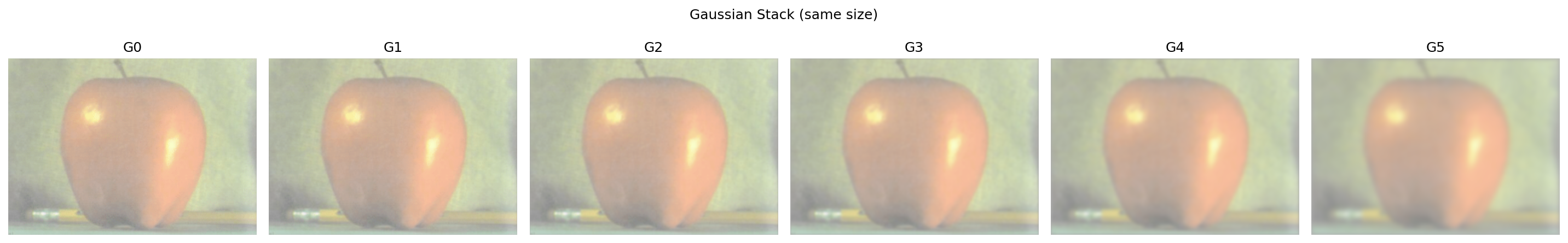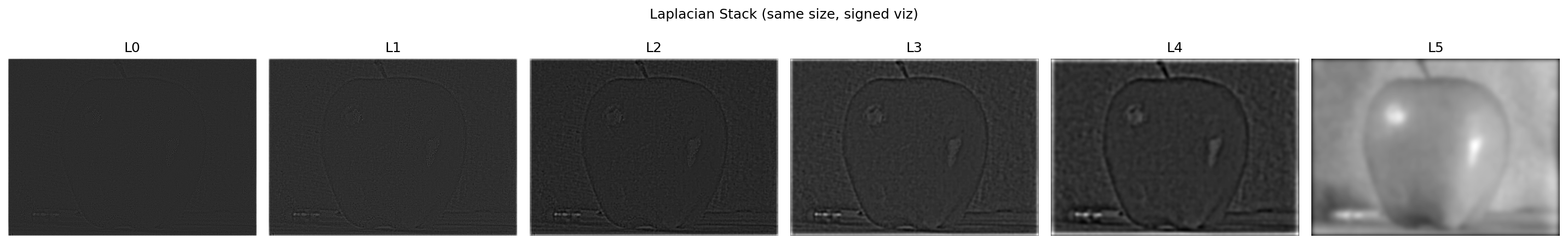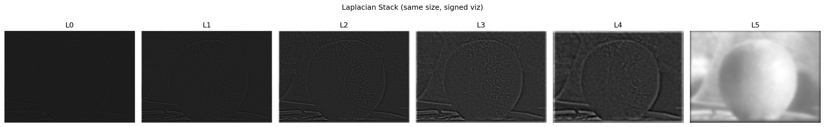 For this section, I implement Gaussian and Laplacian stacks (no downsampling) entirely from scratch. Given an input image , the Gaussian stack applies progressively stronger blurs while keeping the spatial resolution fixed , , … with (default ); equivalently, each level is . The Laplacian stack captures band-pass detail per scale as differences of adjacent Gaussian levels for and the final level holds the residual . Because stacks are never downsampled, every and has the same height and width as , so grayscale stacks can be stored in a single 3D array. I visualize both stacks (Gaussian as clipped images, Laplacian with signed normalization) Finally, I apply these stacks to the apple image example to reproduce example–style panels (Gaussian on top, Laplacian below), which prepares the exact multi-scale ingredients needed for the next part’s multi-resolution blending.