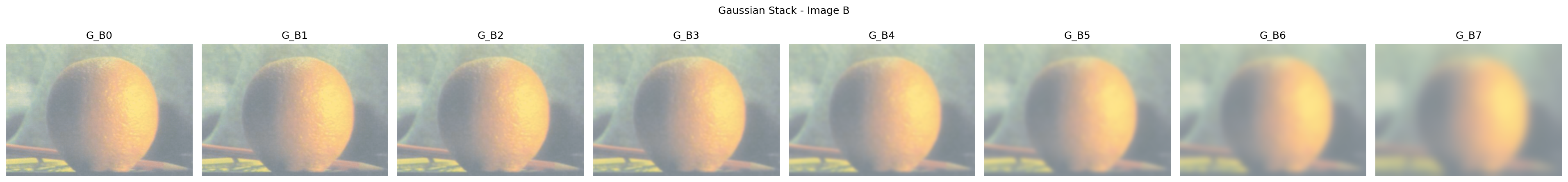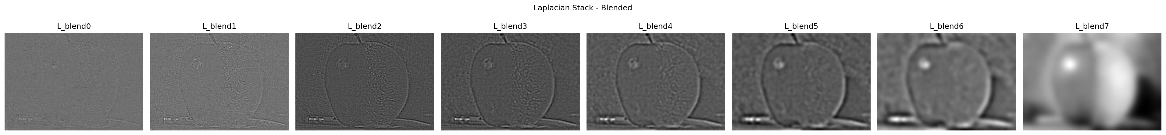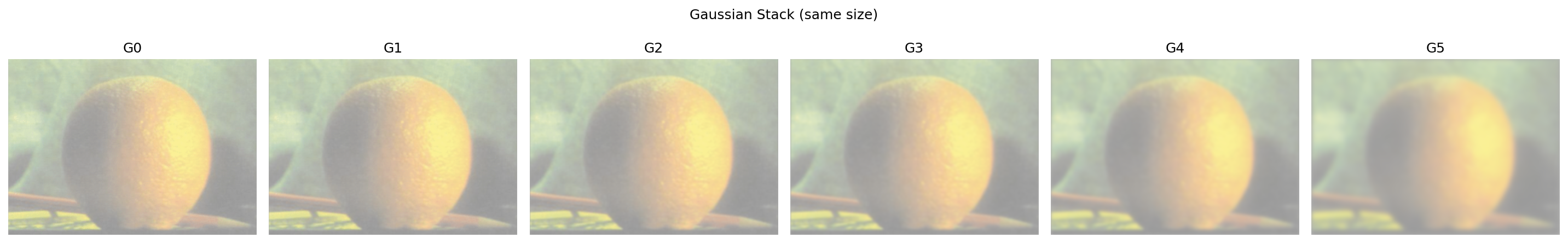 For this section, I implement Gaussian and Laplacian stacks (no downsampling) entirely from scratch. Given an input image , the Gaussian stack applies progressively stronger blurs while keeping the spatial resolution fixed , , … with (default ); equivalently, each level is . The Laplacian stack captures band-pass detail per scale as differences of adjacent Gaussian levels for and the final level holds the residual . Because stacks are never downsampled, every and has the same height and width as , so grayscale stacks can be stored in a single 3D array. I visualize both stacks (Gaussian as clipped images, Laplacian with signed normalization) Finally, I apply these stacks to the apple image example to reproduce example–style panels (Gaussian on top, Laplacian below), which prepares the exact multi-scale ingredients needed for the next part’s multi-resolution blending.