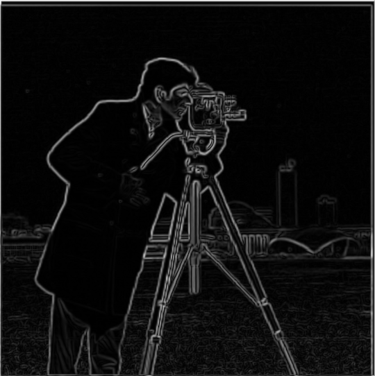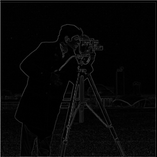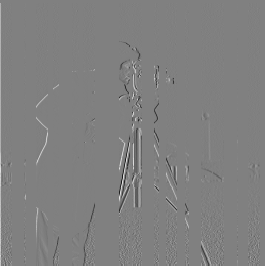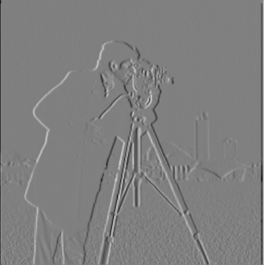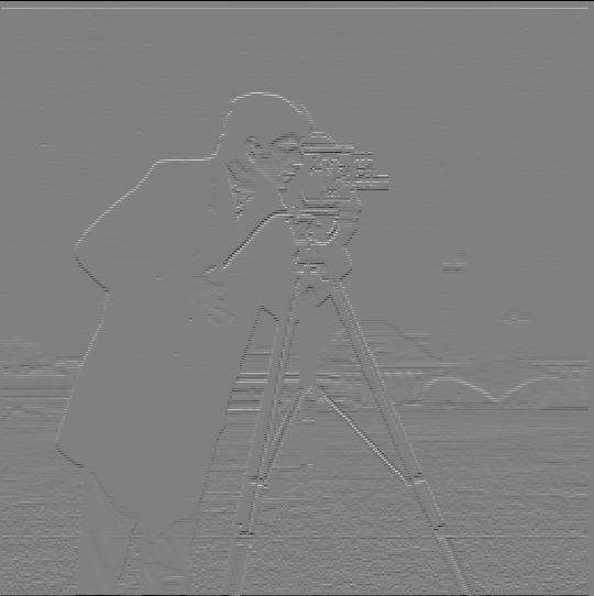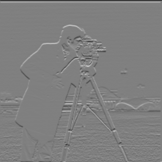 I first smooth the image with a normalized 2D Gaussian and then apply finite differences as in Part 1.2, , , , and . Compared to raw differences, the pre-smoothed gradients are visibly less noisy and the binarized edge maps require a higher threshold to avoid thick edges, yet they better suppress texture noise and speckle while preserving real boundaries. I then form Derivative-of-Gaussian (DoG) filters in one step by convolving the Gaussian kernel with the difference operators , (saved and visualized as signed images), and apply them directly , , and we have . By associativity of convolution, (and similarly for ), so the one-step DoG and two-step smooth-then-differentiate pipelines match; I verify this numerically by reporting near-zero RMSE(Root Mean Squared Error, which measures the typical size of the difference between two arrays (e.g., two images) in the same units as the data) between , , and their gradient magnitudes, and I produce difference heatmaps for completeness. As in 1.2, I threshold (or ) using either a fixed or quantile-based to generate qualitatively clean edge maps that balance noise suppression and edge completeness.